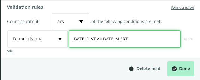 - The 'Alert Date' is always after the date that your programme started This can be done with a simple Validation rule, there is not need for a formula