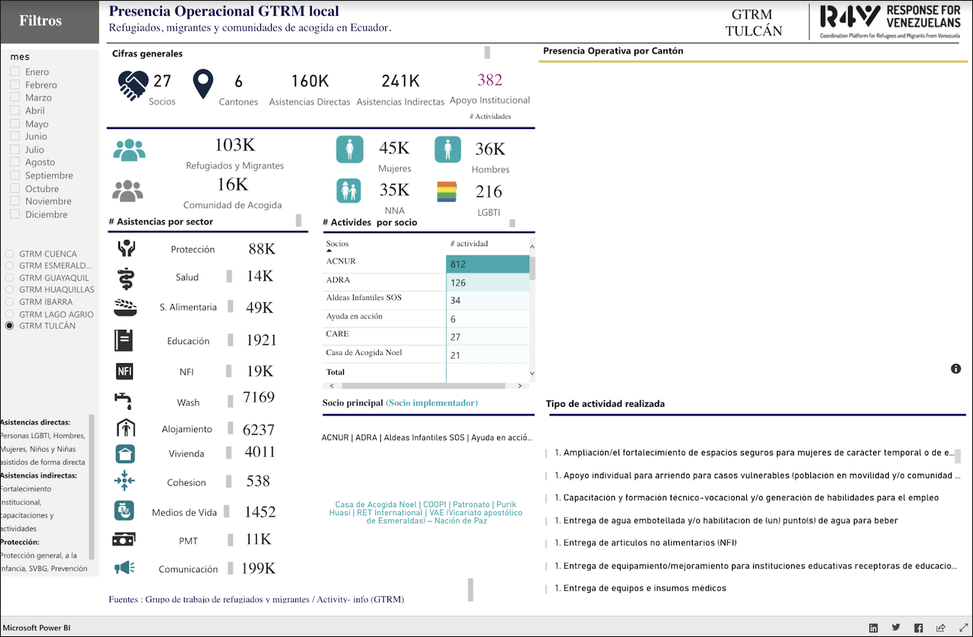 The working group “Grupo de Trabajo para Refugiadas y Migrantes (GTRM)“ in Ecuador combines data from ActivityInfo with Power BI to present information related to the Venezuelan Response as well as the Operational presence.