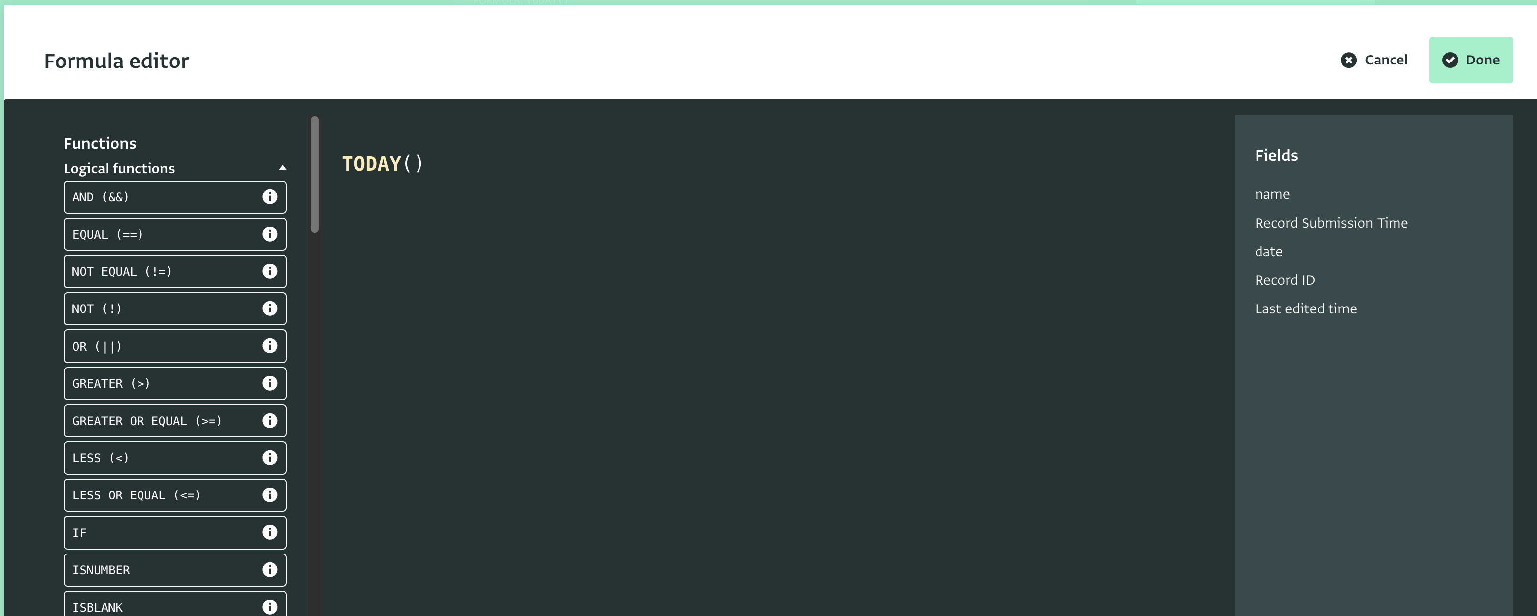If you need to report on the date a Record was added to a Form, for accountability reasons, you might want to set a default value for a Date field titled “Date record added.” If you expect Records to be added on different dates, you can generate the default value using a Formula with the TODAY function to dynamically populate the current date when the Record is added. You would then set the Field as read-only to ensure that users would not be able to modify the date in the future.