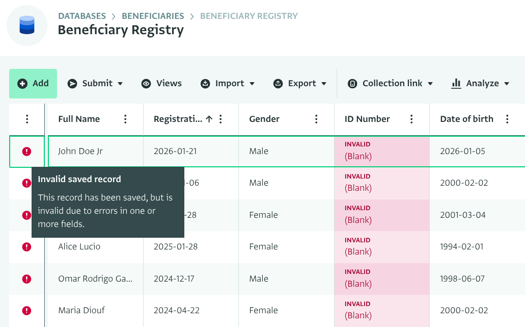 This behavior is always present in ActivityInfo, but it becomes visible in the interactive table, where many records are displayed at once and invalid cells are highlighted immediately.