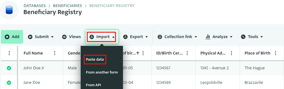Después de configurar el Formulario en ActivityInfo, siga estos pasos para importar datos desde una hoja de cálculo: