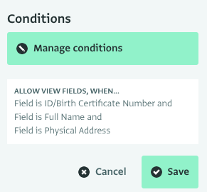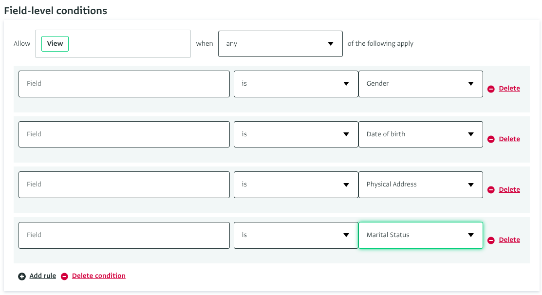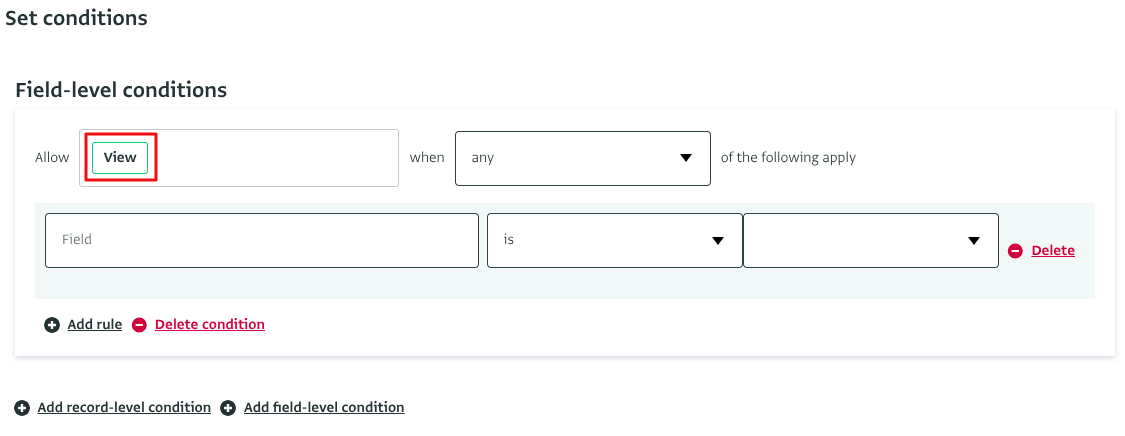 - Seleccione Añadir condición a nivel de campo para crear una condición que permita a los usuarios ver los valores de los campos cuando se cumpla cualquier condición. En Permitir, seleccione Ver, y en Cuando, seleccione cualquiera.