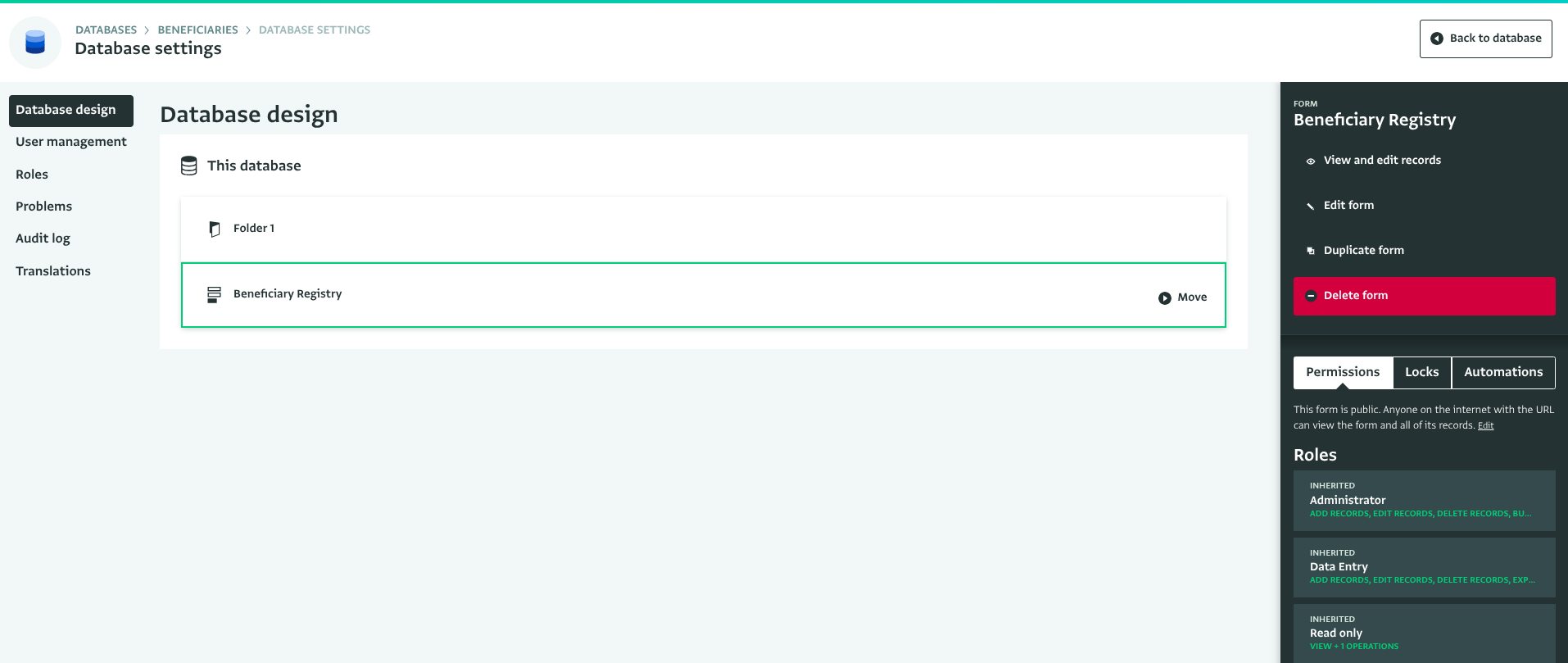 - Vaya a Diseño de base de datos y seleccione el formulario para el que desea configurar los permisos a nivel de campo.