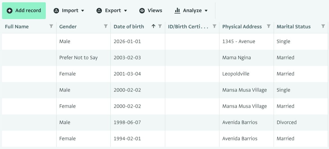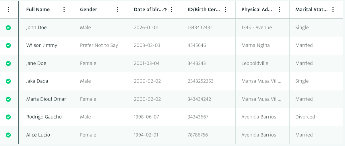 Las reglas anteriores permiten a un usuario de Entrada de datos ver únicamente Género, Fecha de nacimiento, Dirección física y Estado civil.