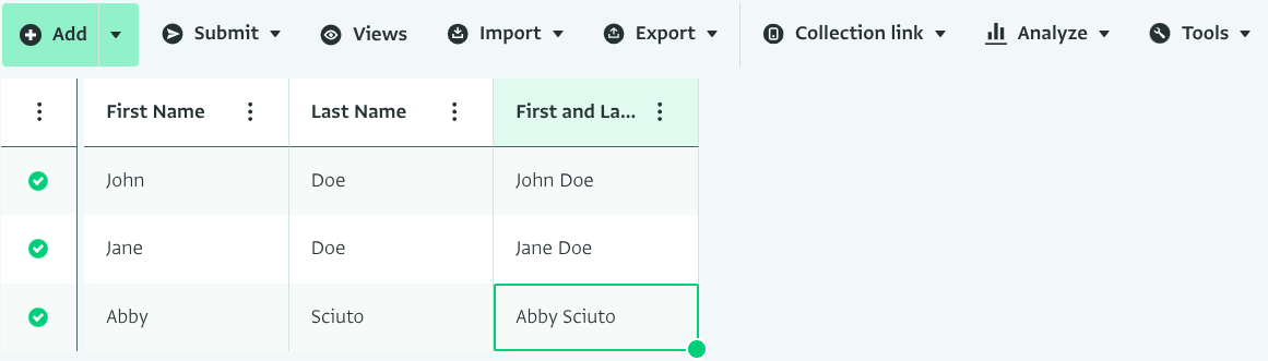 Dans cet exemple, lors de l'ajout d'Enregistrements, les valeurs des Champs de texte Prénom et Nom de famille sont combinées automatiquement.