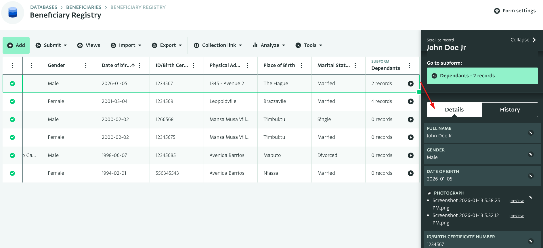 La section suivante décrit les étapes pour voir les Détails d'un Enregistrement dans l'onglet Détails du panneau latéral de l'Enregistrement en Vue Tableau. Cela vous permet d'avoir un aperçu des Enregistrements ajoutés en un coup d'œil.