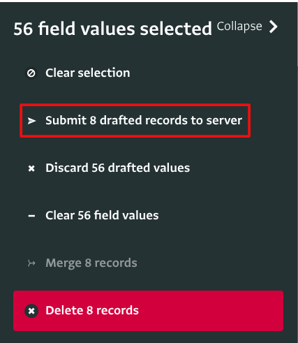 - Select all the draft records by clicking on the first cell and dragging over all the records you want to submit or by using Ctrl + A. On the record panel on the left side, click on Submit drafted records to server to save the records.