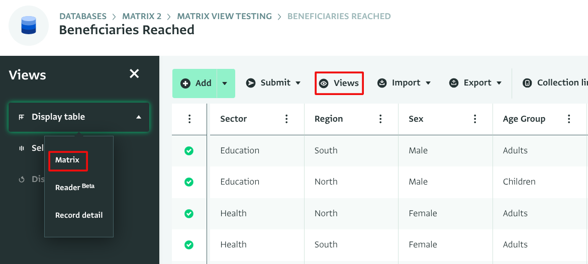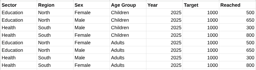 The Matrix View is designed to make working with highly disaggregated indicator data both efficient and reliable. By transforming long-format records into an interactive, pivot-table-style interface, it allows users to enter, review, and validate large volumes of data in a way that closely matches how results are typically reported and reviewed.