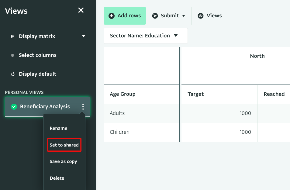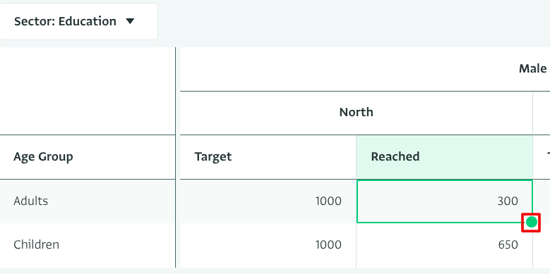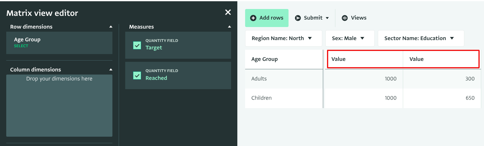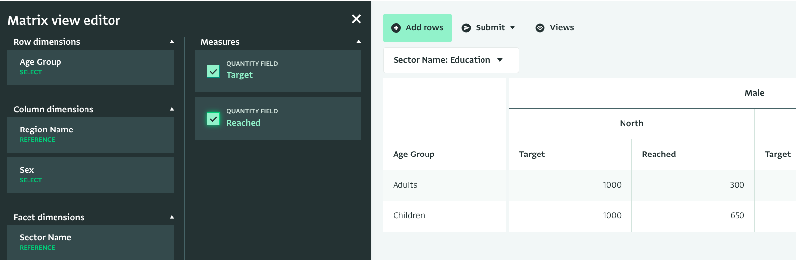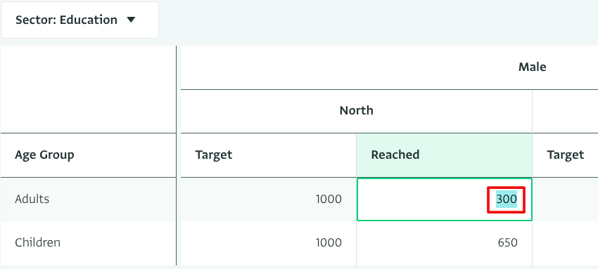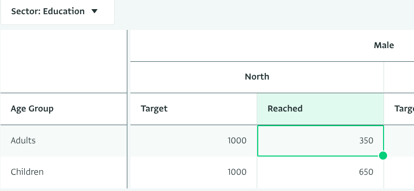 Example of a Matrix View showing the number of male adults and children beneficiaries reached in the education sector in the North region.