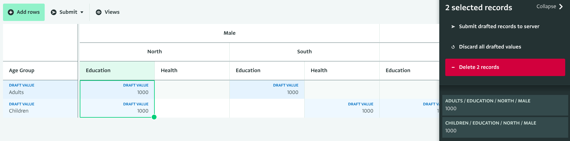 - On the records panel, there are options to either submit the drafted records to the server, discard all the drafted values or to delete the selected records.