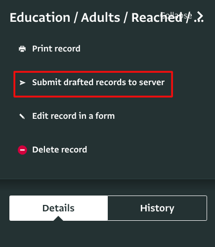 - The record immediately turns into a draft that is saved in your local device until the record is submitted to the server to commit the changes. Click on the record panel on the right side and click on Submit drafted records to server.