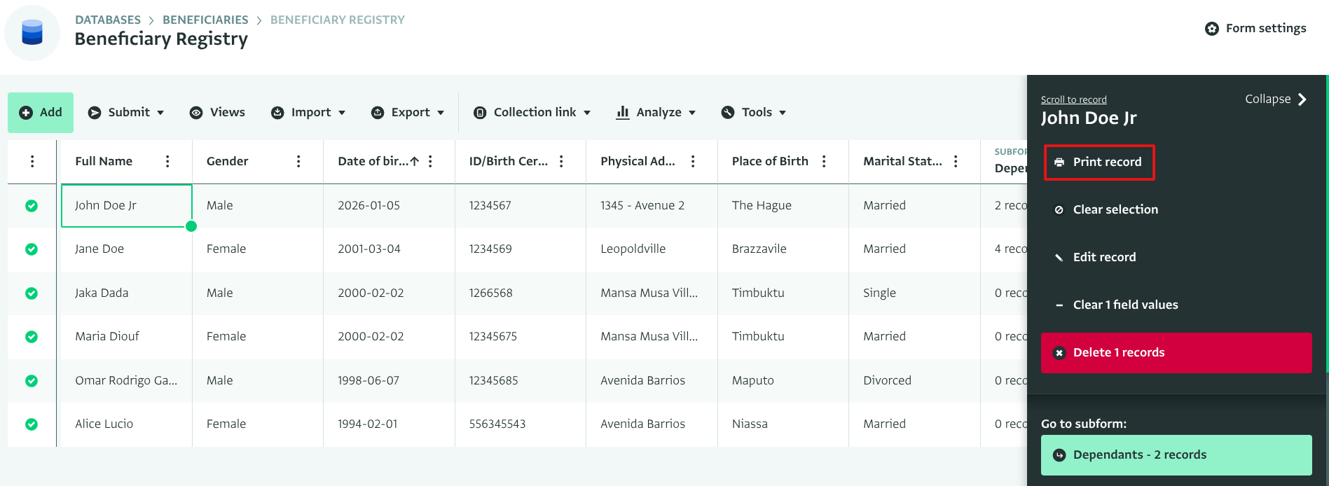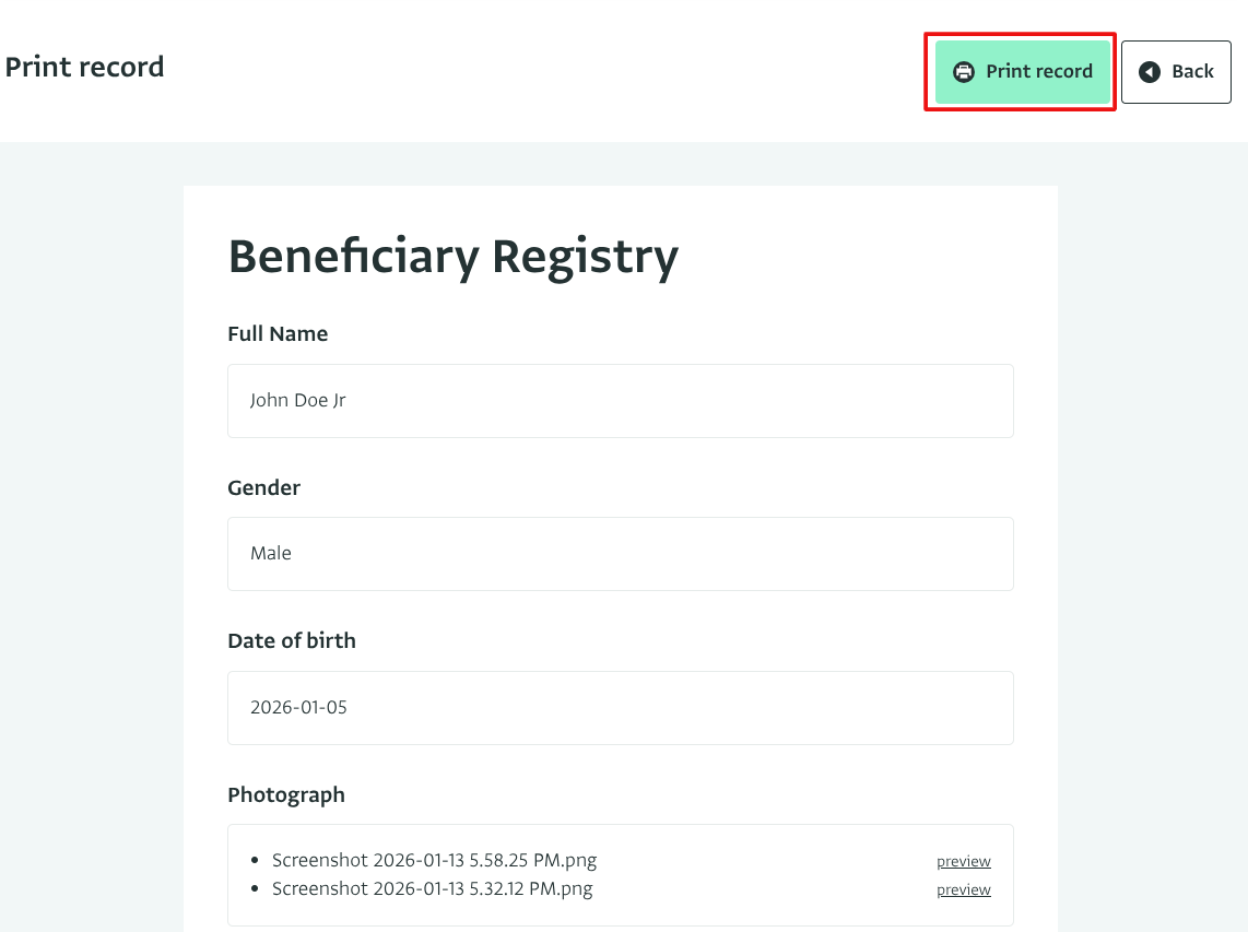 - On the next page, you will see the Record you selected, click on "Print record" to open the Print dialogue box.