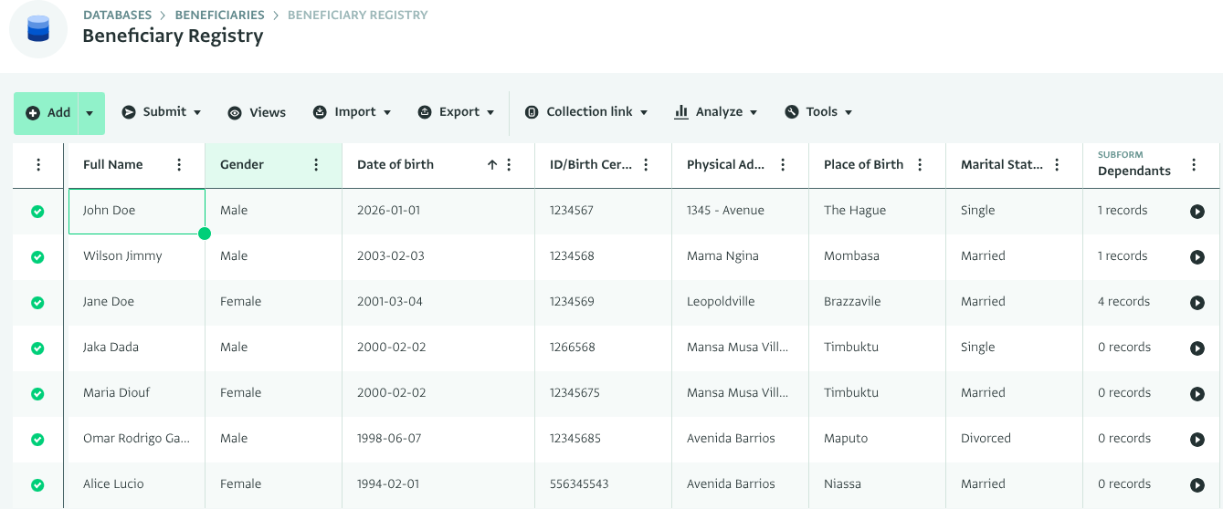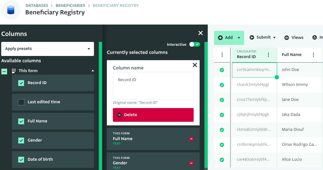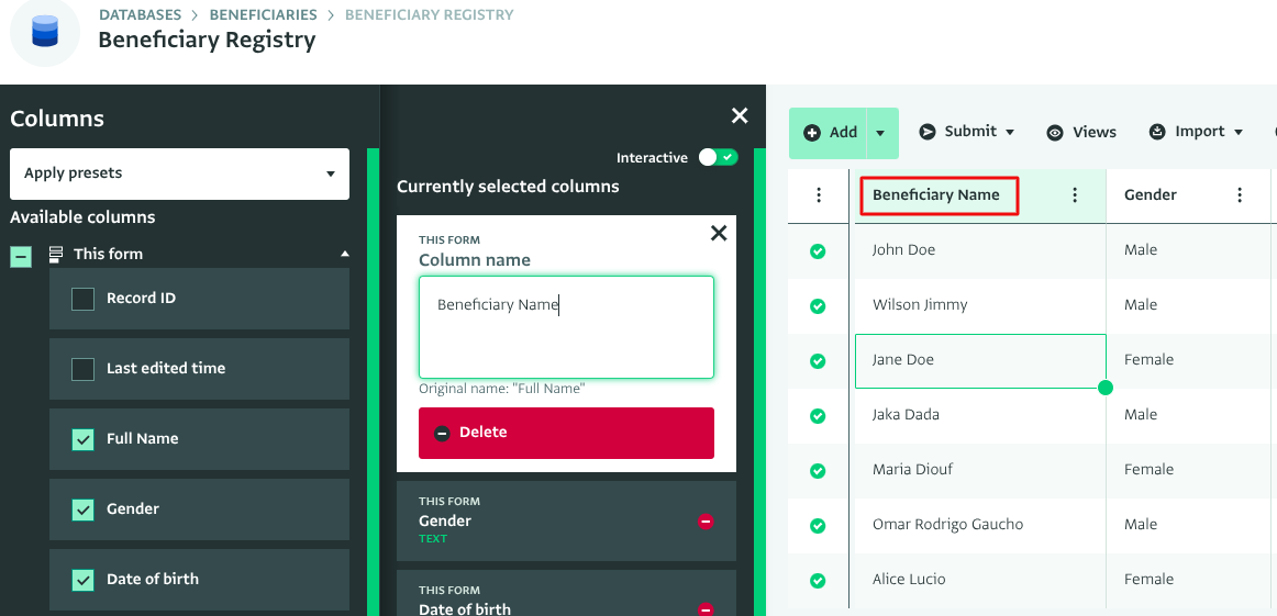 - Rename a column to change the header in the Table View. This does not affect the Data Entry page. You can also still see the original name for reference. Click on the column and type in the custom column name.