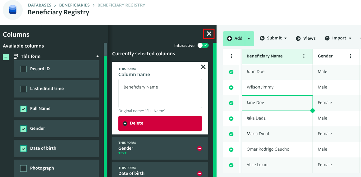 - Apply your selection by clicking on the "X" mark on the top right corner of the “Columns” side panel.