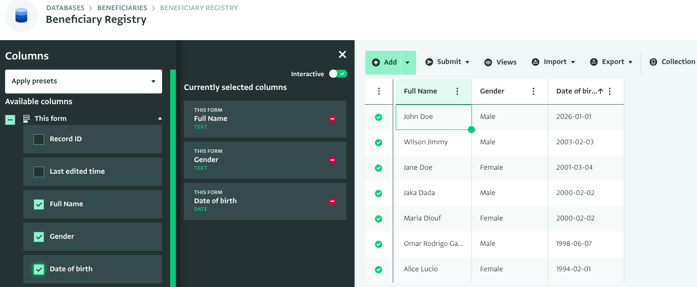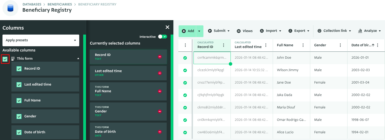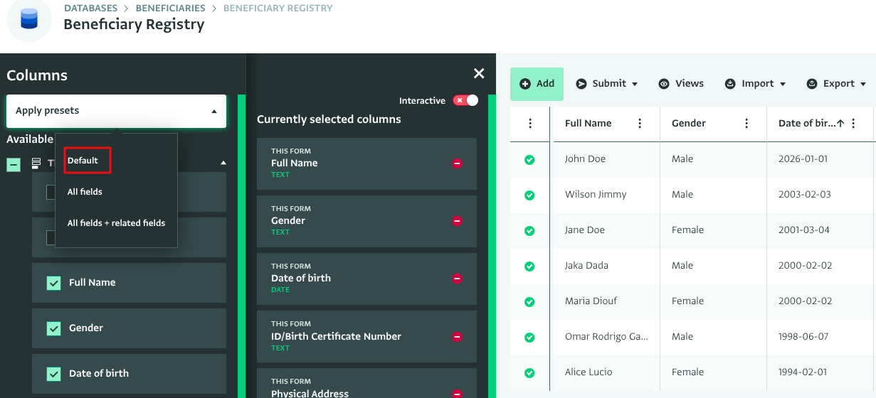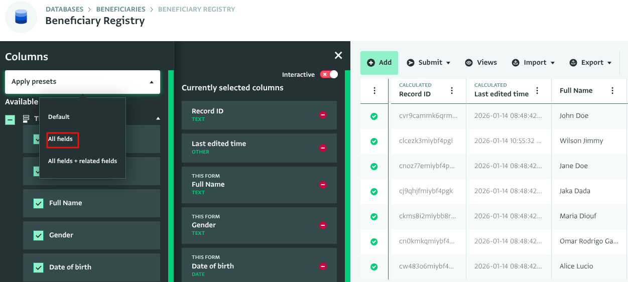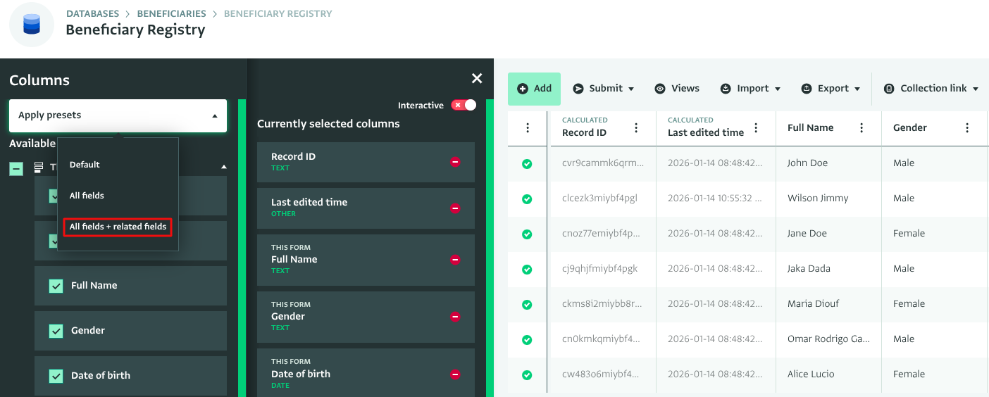 The "all fields + related fields" preset selects all of the fields from the current form you have open in the Table View, as well as all fields from related forms which are linked via reference fields. Click on “Apply presets” and select “All fields + related fields”.