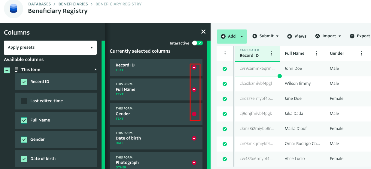 - To remove a column from the "Selected columns" list, click on the red “Delete” button on the column. Alternatively, click on the column that you want to remove and click on the "Delete" button.