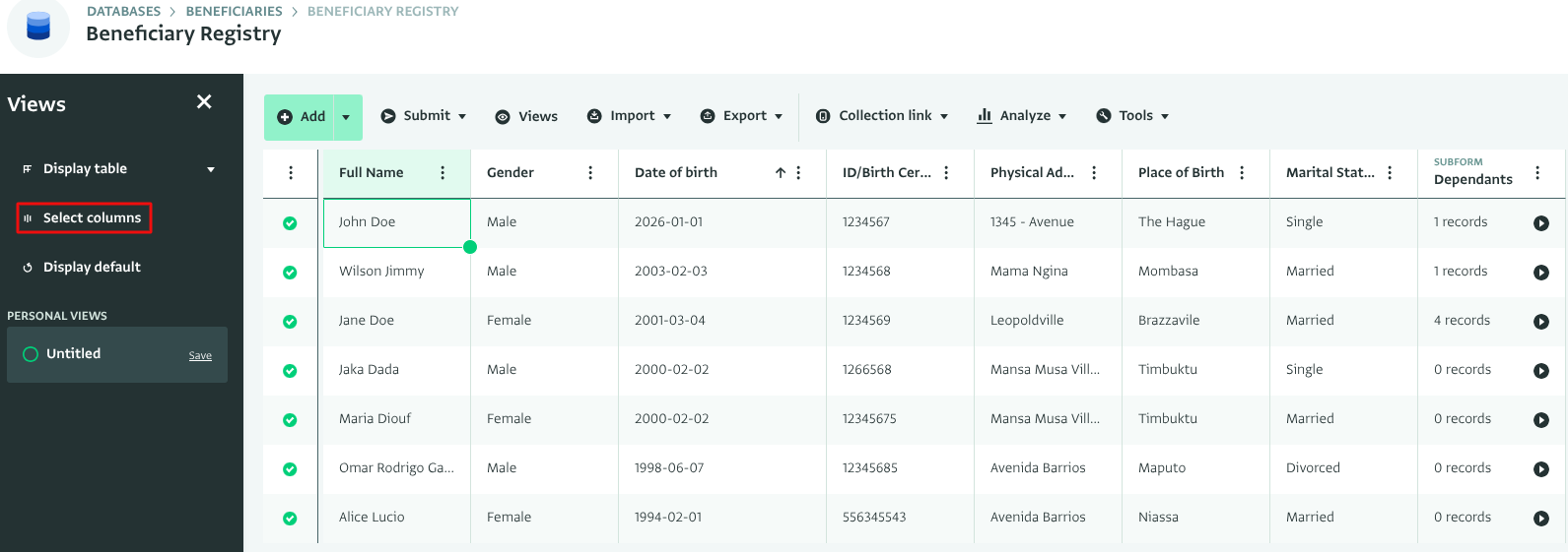 - Click “Select columns” on the “Views” side panel.