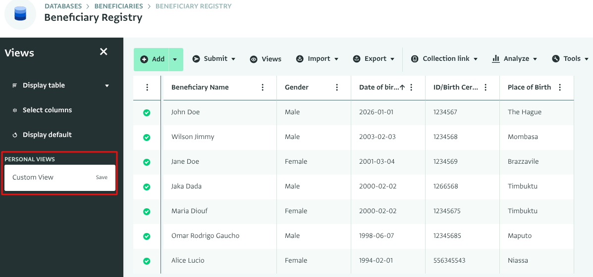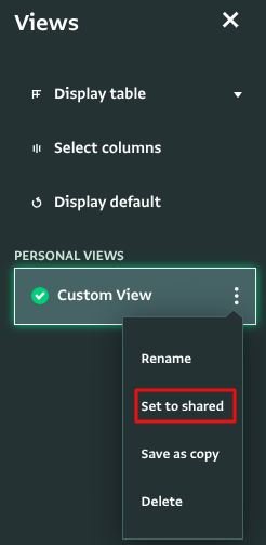Click on your personalized view and click “Save as copy”, and update the columns according to your needs. - Optionally you can share your personalized view with your Database users by clicking on the Custom view and selecting “Set to shared.”