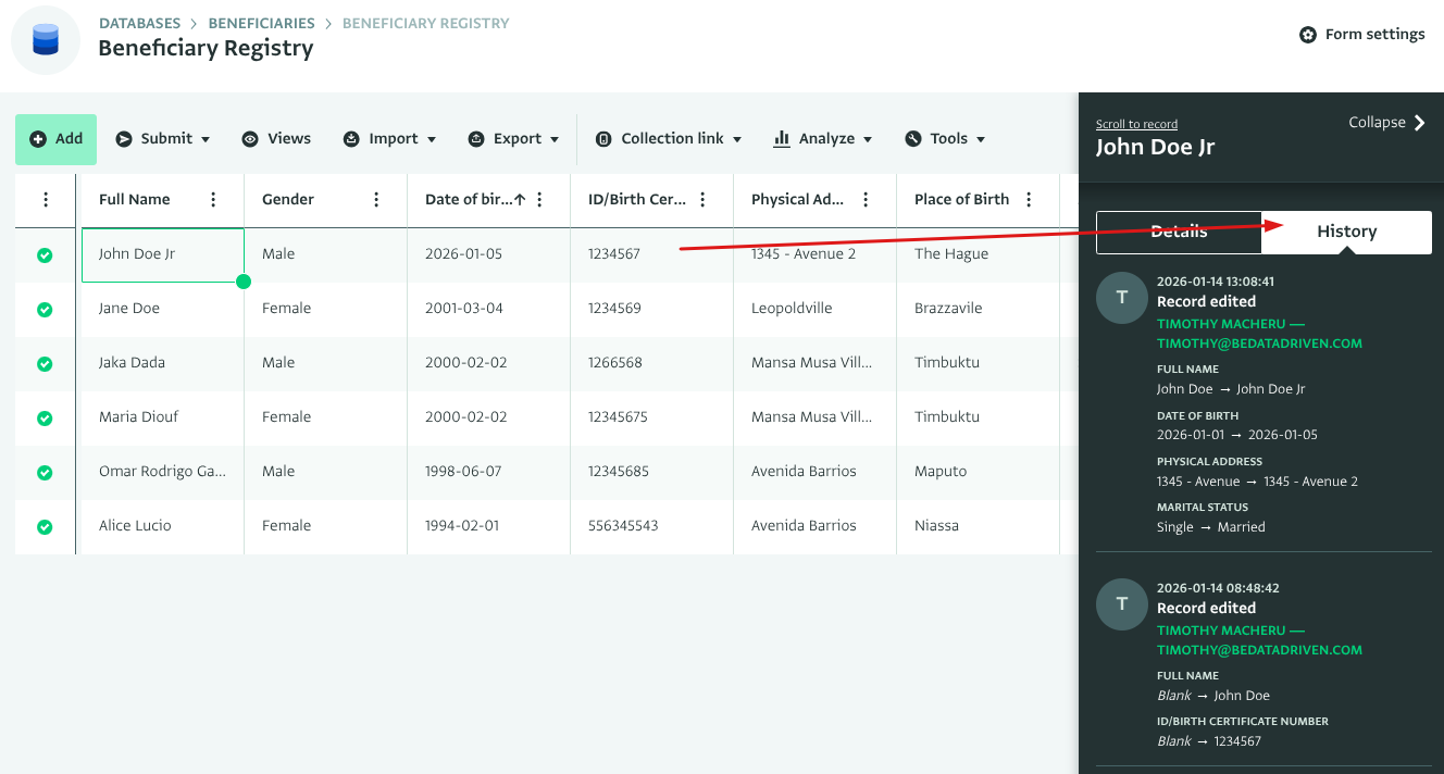The following section describes the steps for viewing the History of a Record added to Form using the Record side Panel. This allows you to have an overview of changes made to the Records and of users making these changes.