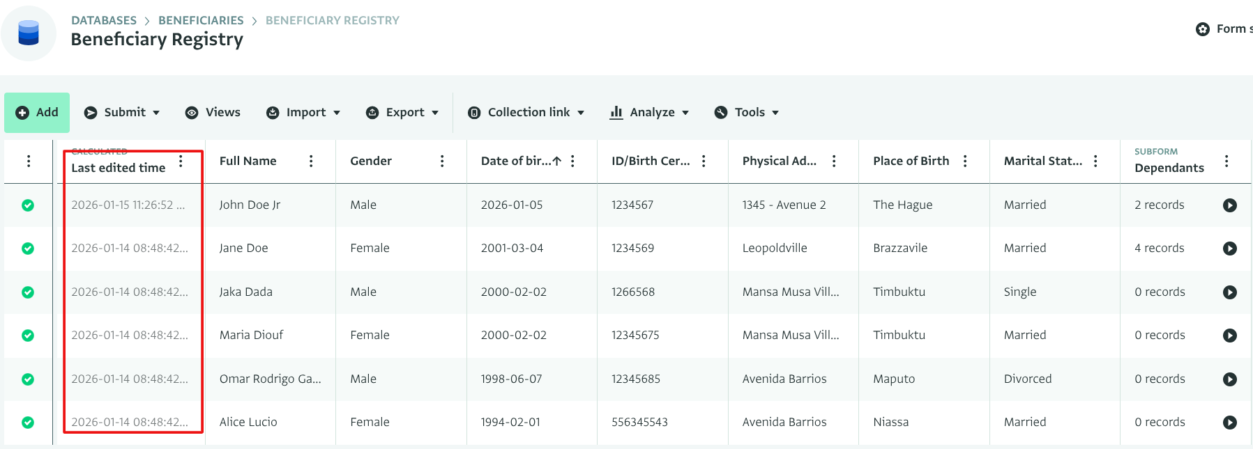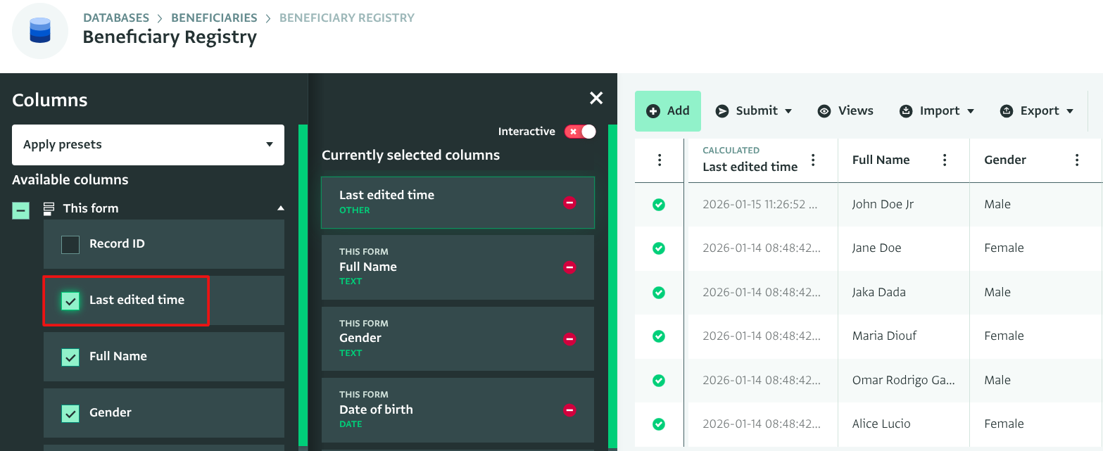 You can view the last time a Record was edited so as to quickly identify changes and additions to Records. This metadata appears in the History tab of the Record panel and can also be selected as an additional column using the 'Select columns' button in the Table View of your Form.