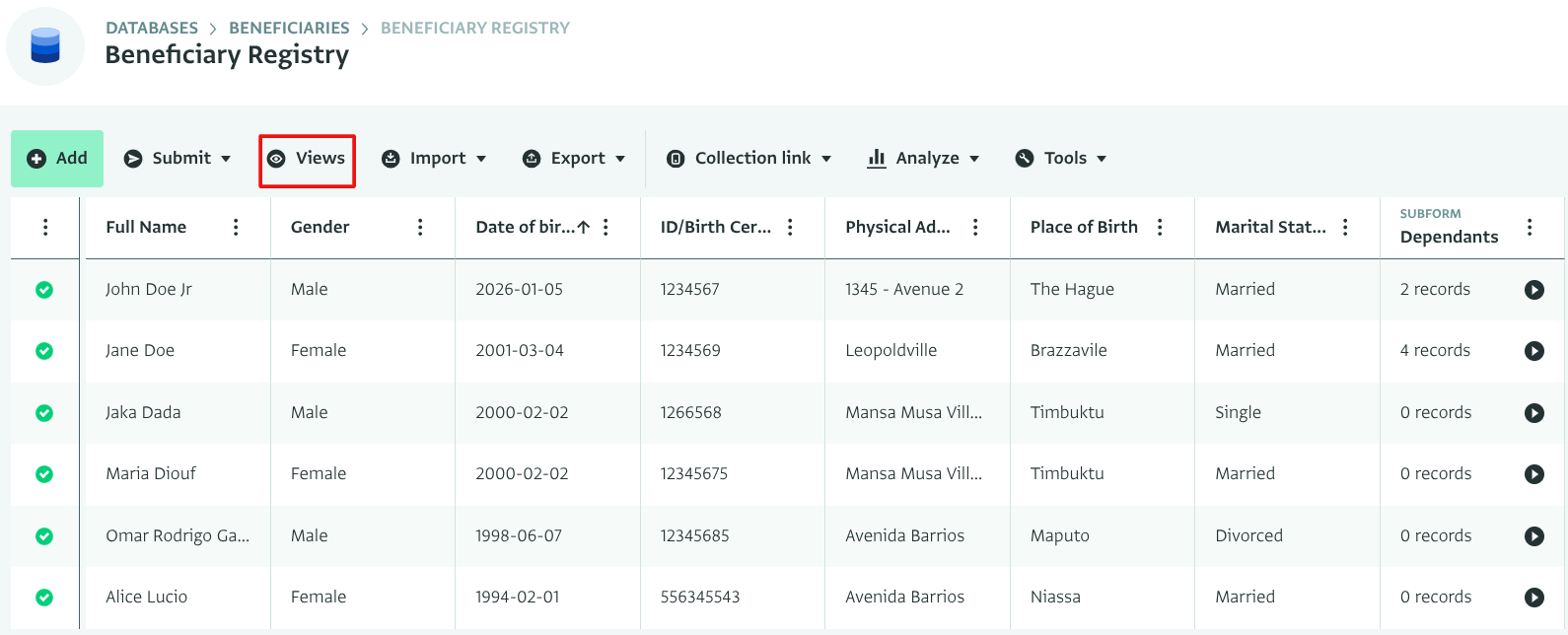 - Navigate to the Table View of your Form and click on 'Views'.