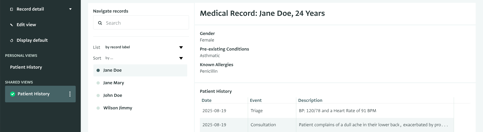 This template uses the Record Detail View, which provides a powerful way to bring together all relevant patient information onto a single, organized page. This eliminates the need to switch repeatedly between records and sub-records, streamlining case management and improving decision making.