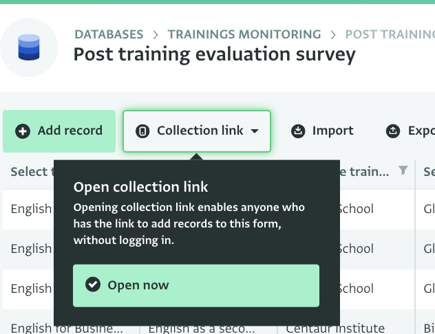 After completing a training session you can invite participants to fill in a survey about it using the ‘Post training evaluation survey’ form. The training participants don’t need to be users of ActivityInfo to access the survey. You can open a collection link to that form and share the link with participants to collect their answers. To open a collection link, navigate to the Table View of the form and click on ‘Collection link’ and then on ‘Open now’.